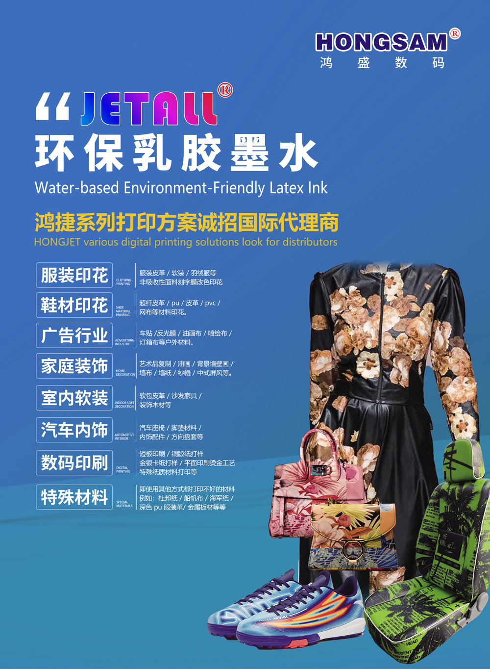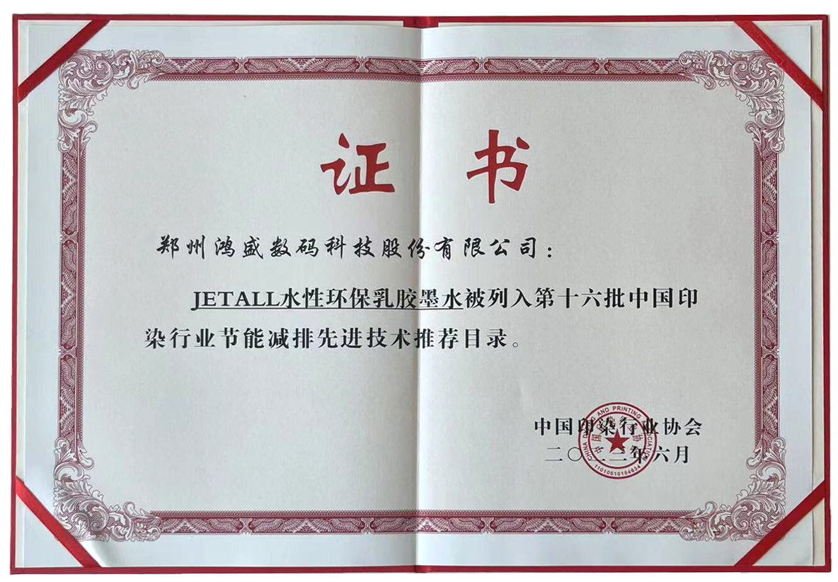 鴻盛數碼以JETALL®水性環保乳膠墨水印刷方案為申報主題,現場展示了產品打印的成品、通過視頻演示了打印過程,以圖片形式說明了項目技術原理。JETALL®水性環保乳膠墨水印刷方案解決了在非吸收性介質不吸收、不能成像的技術難點,打印的產品具有無氣味、無腐蝕、無揮發、色彩飽和度高、牢度好等優點,可廣泛應用于數碼印花、數碼印刷、數碼影像、藝術品復制、家居裝璜等各種領域。JETALL®水性環保乳膠墨水通過國際權威SGS公司檢測和國家棉花及紡織服裝產品質量監督檢驗中心檢測,2023年6月成功入選《第十六批中國印染行業節能減排先進技術推薦目錄》。