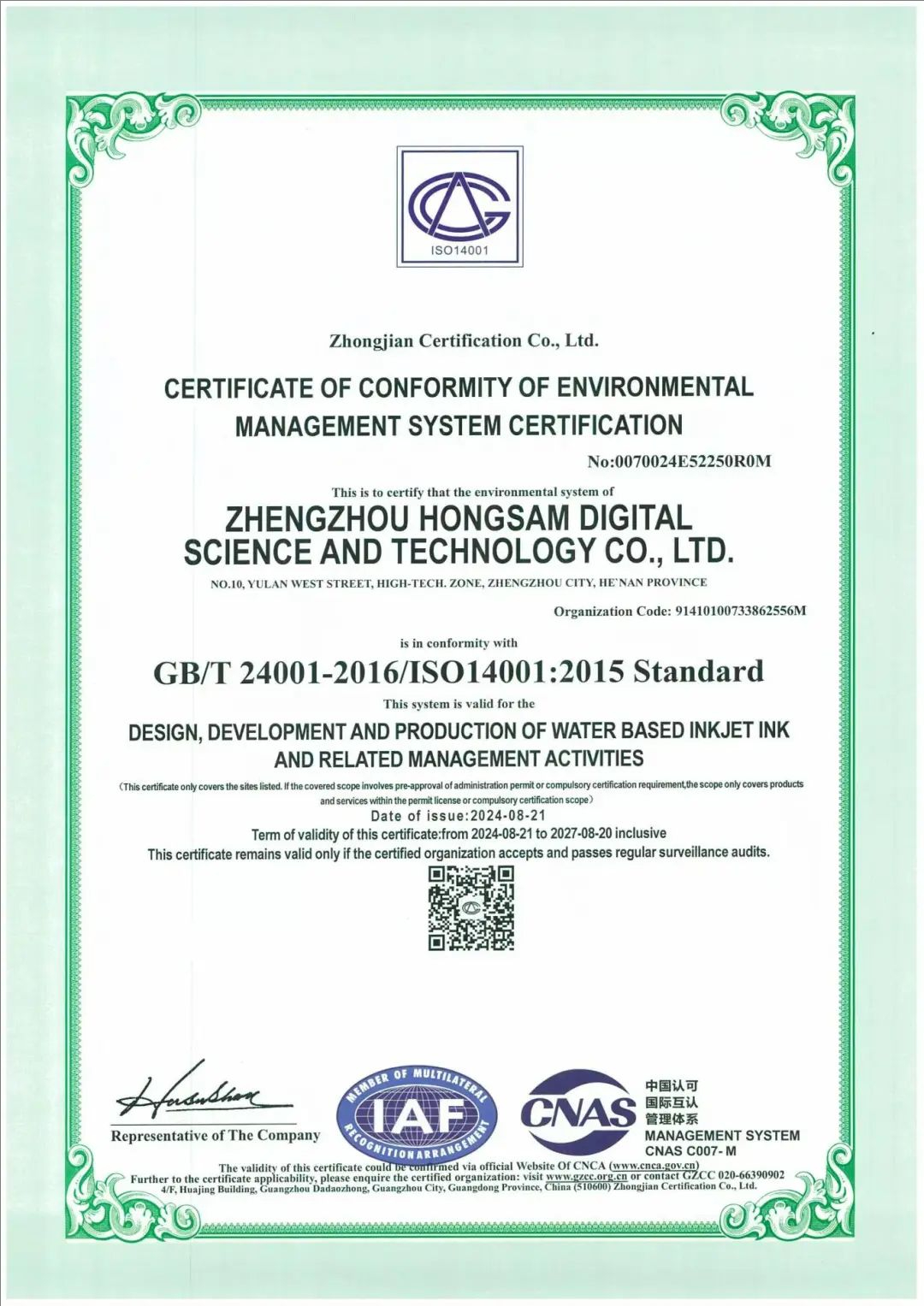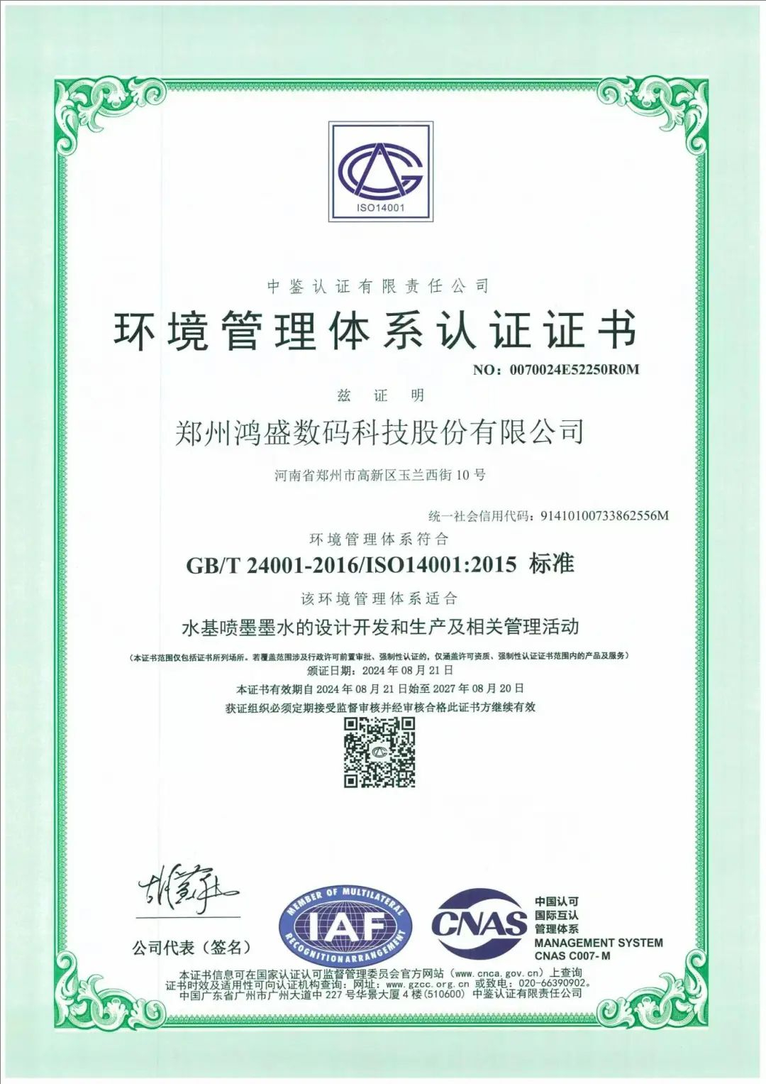 8月21日,鴻盛數(shù)碼收到了認證機構頒發(fā)的ISO14001環(huán)境管理體系認證證書。