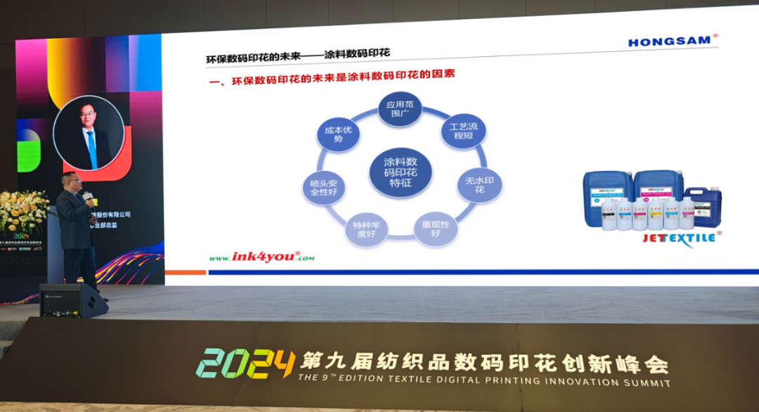 峰會會議內容ACADEMICPRESENTATIONS本次大會上,鄭州鴻盛數碼科技股份有限公司數碼印花事業部謝竟先生以《環保數碼印花的未來——涂料數碼印花》為題對涂料數碼印花進行了詳細闡述,從環保數碼印花發展背景,談到涂料數碼印花的特點、優勢,以及涂料數碼印花高速發展的現狀和未來的發展潛力。由淺入深,對涂料數碼印花進行了深入的分析。分享中有很多專業的知識、行業的發展情況,也給大家帶來很多啟示。