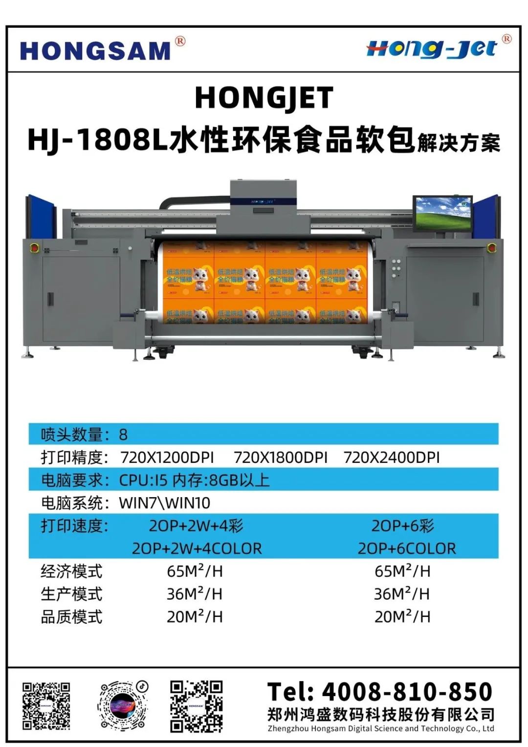 水性乳膠方案的維護(hù)成本較低,且一臺(tái)設(shè)備可應(yīng)對(duì)多種材料,減少了設(shè)備配置和維護(hù)成本,打印速度較快,例如HJ-1808L乳膠打印機(jī)每小時(shí)可輸出60m。