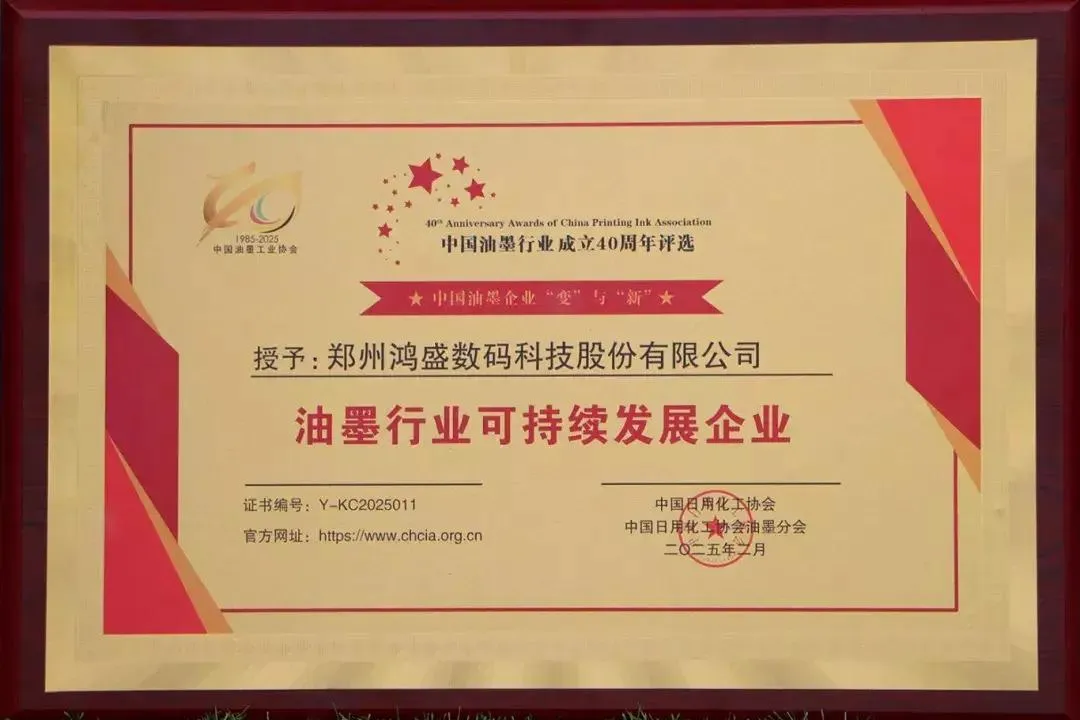 ?2021年,鴻盛數碼和鄭州大學合作的“數碼噴印墨水制備關鍵技術及其應用”項目榮獲“中國紡織工業聯合會科技進步二等獎”