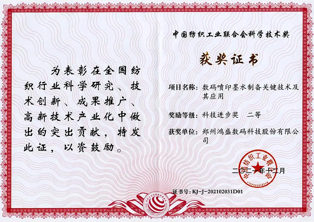 ?2021年,鴻盛數(shù)碼和鄭州大學(xué)合作的“數(shù)碼噴印墨水制備關(guān)鍵技術(shù)及其應(yīng)用”項(xiàng)目榮獲“中國紡織工業(yè)聯(lián)合會(huì)科技進(jìn)步二等獎(jiǎng)”